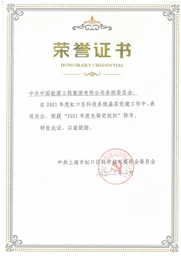 会议的最后,对虹口区科技系统基层党建工作中表现突出的党组织进行了表彰,中国能源工程集团有限公司系统党委荣获“2021年度先锋党组织”荣誉称号。