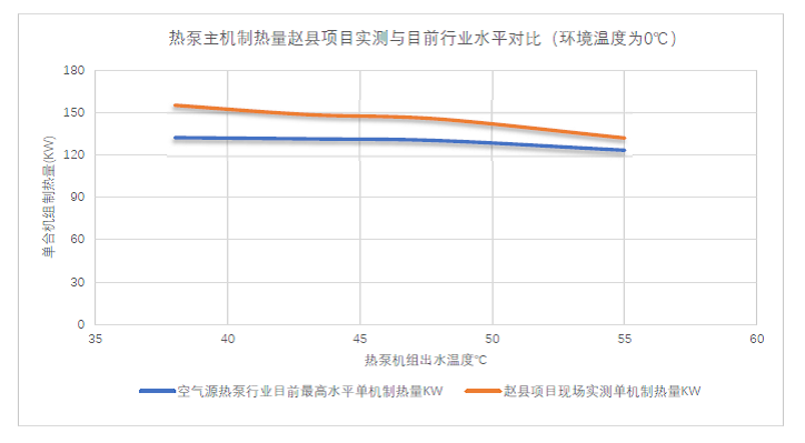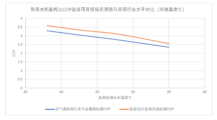 今年1月,项目业主方组织了包括投资方、运营方、建设方、监理及设备供应商等六方验收。此次验收从46个站点1200台机组中随机抽取3个站点的20台设备进行了2-3小时的连续测试和数据采样,将测试结果与2019年7月的实验室测试数据作比对。现场性能测试过程中,即使在劣于实验室的环境中,受诸多不利因素影响,如机组输入电压波动、水流量和水温波动、环境温度和湿度变化等,机组取得的平均制热量仍比供应商承诺的考核值高11.6%,平均能耗比(COP)高6.4%,明显优于项目预测的技术经济指标(详见下图)。
