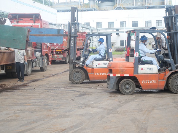 在暂存库前,现场工作人员不畏高温,一趟又一趟地来回装卸物料,叉车司机安全帽里的头发早已被汗水浸湿,但他们仍未有一丝松懈,只为保证到厂物流车辆顺利完成卸车。
