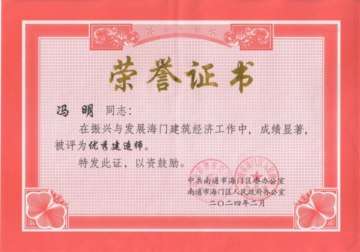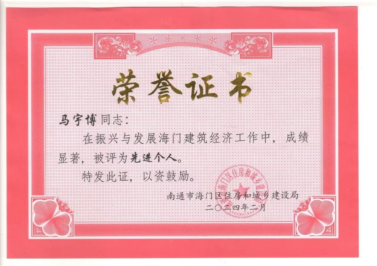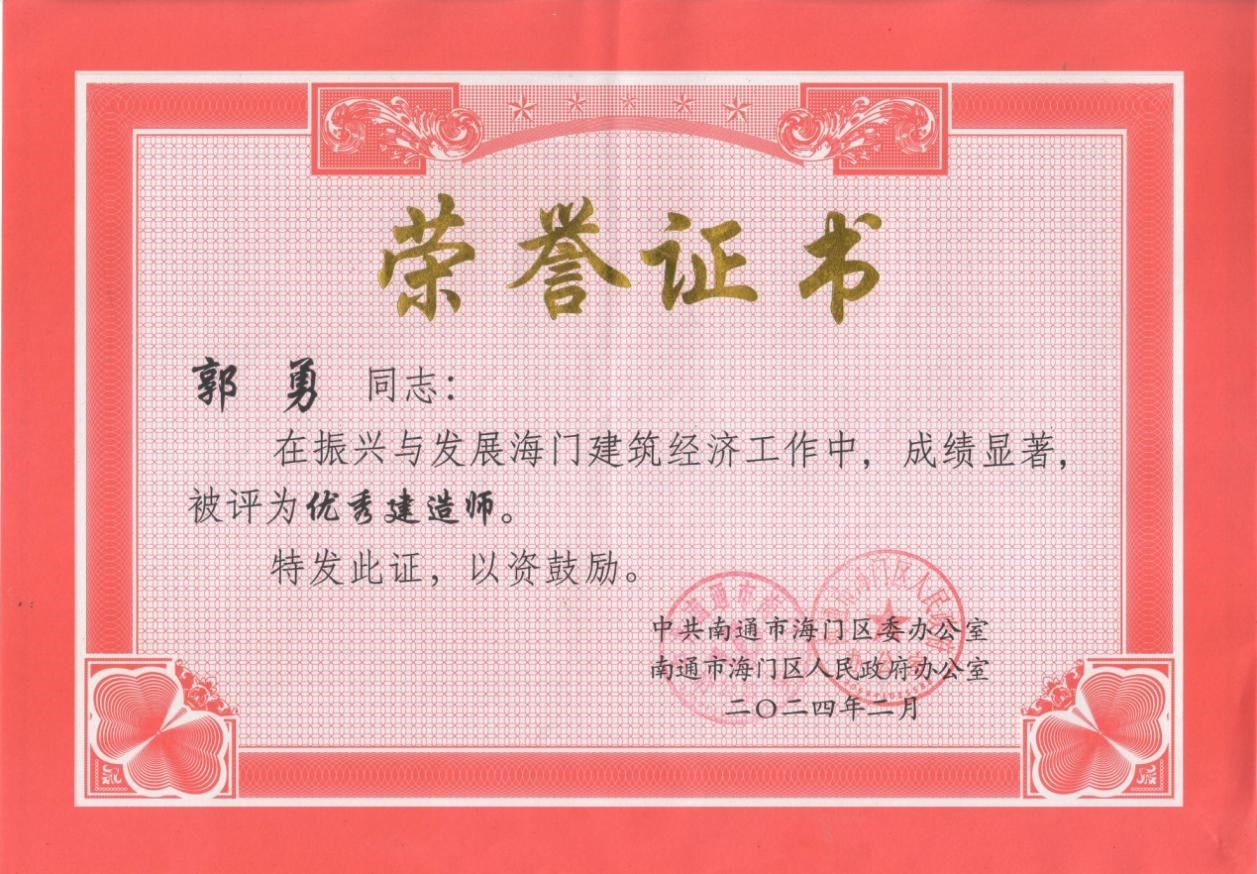 2024年2月20日,中国能源工程集团所属中能源工程集团江苏中源建设有限公司(以下简称中源建设)在2024年南通市海门区建筑业高质量发展大会上受到中共南通市海门区委、区政府的隆重表彰。其中中源建设徐州经济技术开发区凤荟园项目部被评为先进项目部、郭勇同志和冯明同志被评为优秀建造师、马宇博同志被评为先进个人。