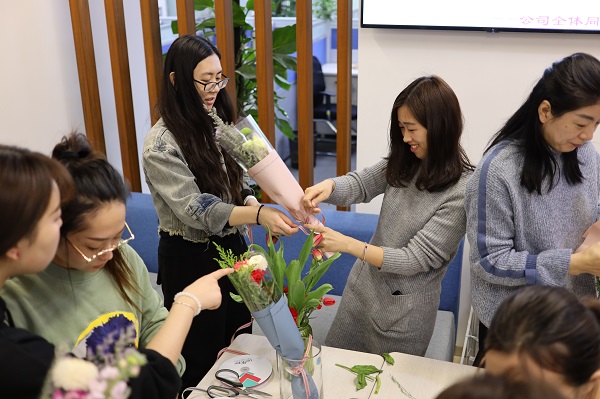一早,公司为各岗位的女职工们准备了一份“小礼物”。彩玫、康乃馨、香槟、相思梅、郁金香,各种花材供各位女神选择与搭配,在送出祝福的同时让大家把盎然的春意带回家。