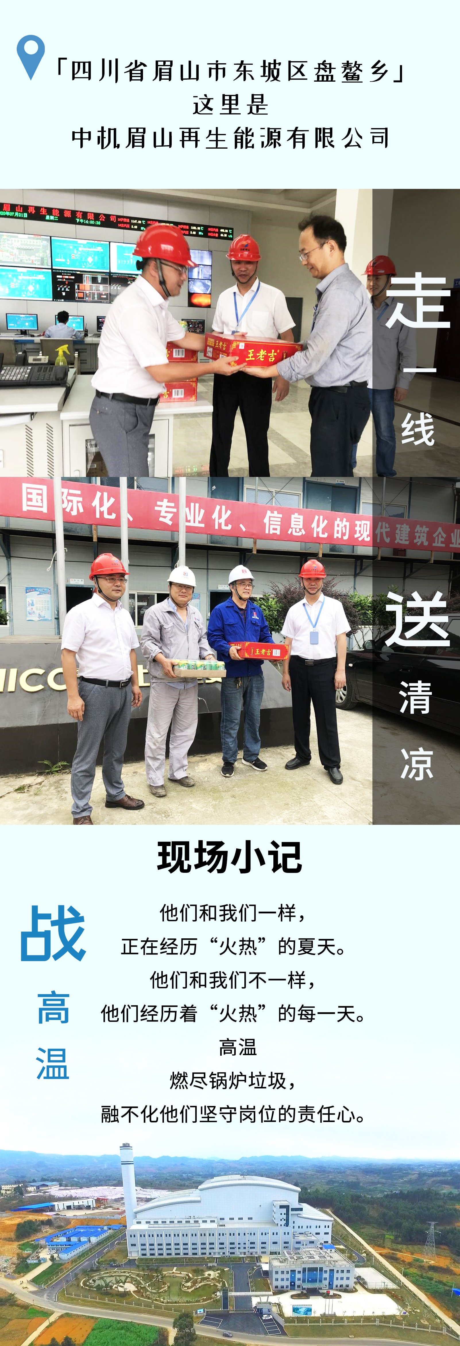 中机眉山再生能源有限公司(简称“中机眉山”)组织开展“送清凉”慰问活动,为公司和项目其他参建单位一线员工发放防暑降温物资。
