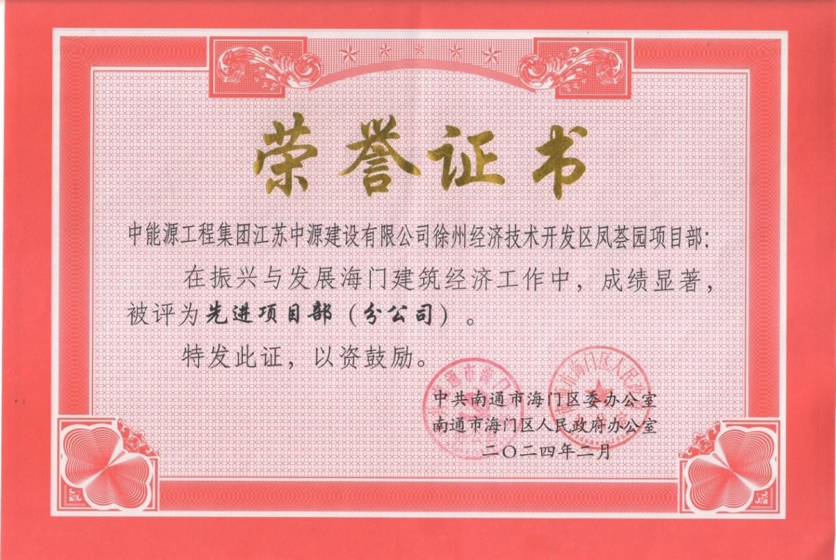 2024年2月20日,中国能源工程集团所属中能源工程集团江苏中源建设有限公司(以下简称中源建设)在2024年南通市海门区建筑业高质量发展大会上受到中共南通市海门区委、区政府的隆重表彰。其中中源建设徐州经济技术开发区凤荟园项目部被评为先进项目部、郭勇同志和冯明同志被评为优秀建造师、马宇博同志被评为先进个人。