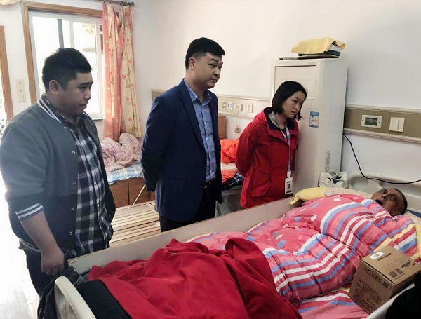 11月20日,在宜川街道党建中心和华阴居委会领导的带领下,集团青年代表们前往老人住处,送上料理机和水果的同时也带去了集团党团青年们诚挚的问候与祝福,鼓励他配合治疗,坚持康复训练,相信不久的将来一定可以重新站起来。病床上的钟叔叔虽然不能说话,却多次激动地留下眼泪。