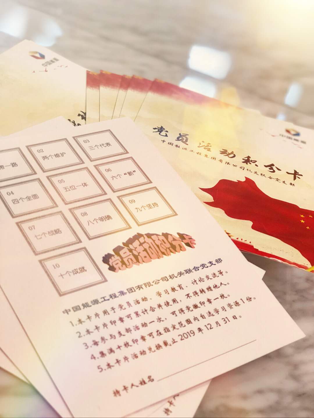 经过一个多月的摸索,此次支部党员大会上正式发布《党员活动积分卡》。积分卡从“一”到“十”,罗列了十九大报告中的经典名词,将党建知识与活动参与情况相结合,以集章兑换学习资源的方式,助力基层党组织标准化建设,打造服务型、学习型党支部。