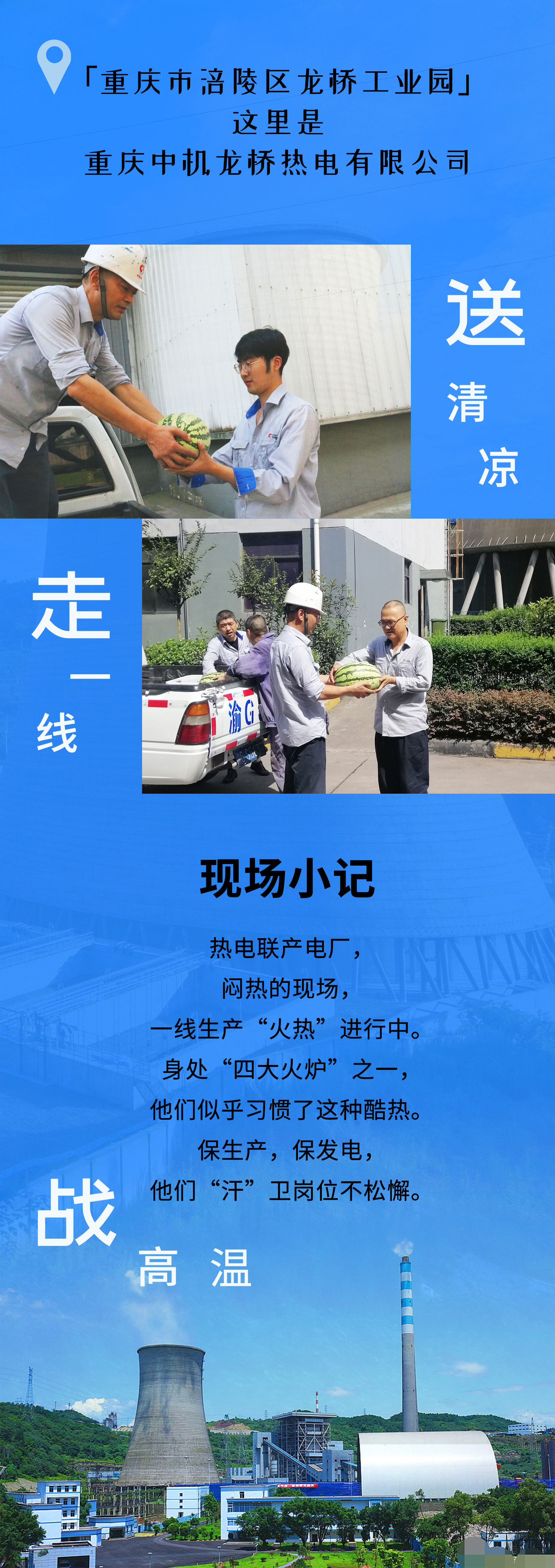 重庆中机龙桥热电有限公司(简称“龙桥热电”)组织慰问一线员工,发放西瓜等解暑物资。公司党委副书记冉义江、副总经理张文超等领导还走访慰问了龙桥工业园区交巡警大队、龙桥街道派出所的执勤交警和基层民警,并送上消暑物资。