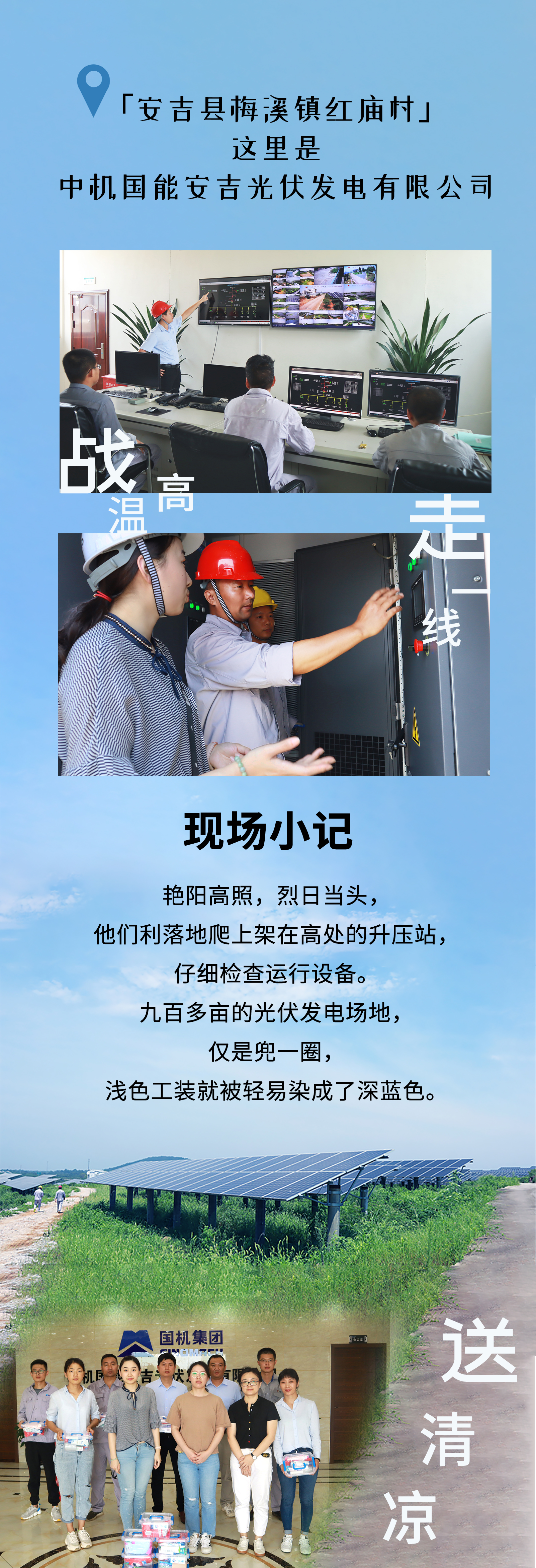 中国能源工程集团工会组织相关人员及中电集团相关人员赴中机国能安吉光伏发电有限公司(简称“安吉光伏”)项目现场,发放防暑降温物资,关心一线员工。