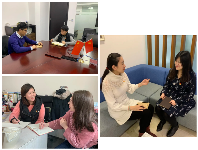 各党支部委员、党员之间全面开展“一对一”谈心谈话,围绕“思想、工作、生活”等方面坦诚交流,互相倾听,找出问题与差距,共同探讨解决与改进方法。